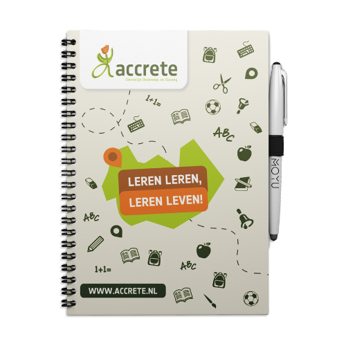 Voor Accrete, de christelijke kindcentra organisatie in de Kop van Overijssel, hebben wij 100 uitwisbare notitieblokken mogen leveren. Accrete gelooft dat ieder kind uniek en waardevol is en zich ontwikkelt in zijn of haar eigen tempo. Met de uitwisbare notitieblokken kunnen medewerkers eenvoudig notities maken, aanpassen en hergebruiken. Dit is praktisch in een dynamische leeromgeving waar kinderopvang en basisonderwijs samenkomen.